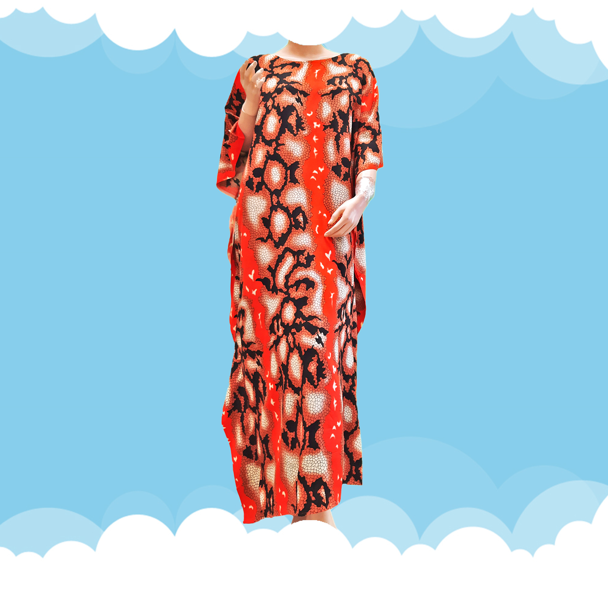 Its loose fitting design and the nature of this beautiful kaftan complements wide range of body shapes and it drapes very beautifully !
